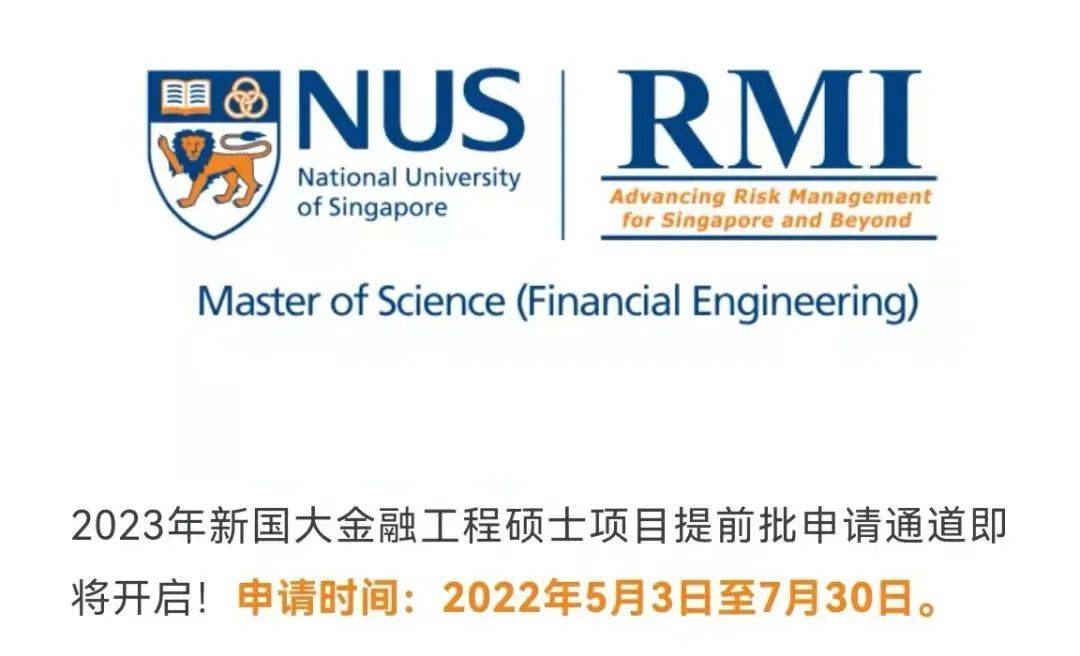据“NUS新国大金工之友”最新消息,2023年新加坡国立大学金融工程硕士提前批将于5月3日正式启动,并于7月30日停止接受申请!去年提前批开放申请的时间是5月14日,今年时间提前了两周。