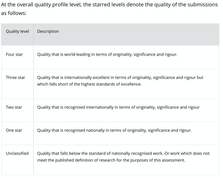 最新的REF排名共有157所英国大学被纳入评估,参与评估的委员会主要根据以下三个指标,按照质量高低分别给各学校和各学科进行星级评定: