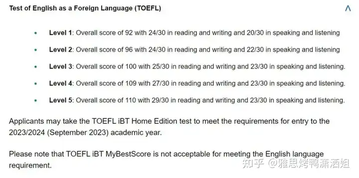 除此之外,语言成绩截止时间提前、医学院和建筑与环境学院提高申请要求、5大学院不接受重考...而托福成绩要求也一样,调整成了1-5五个Level,要求越来越高....